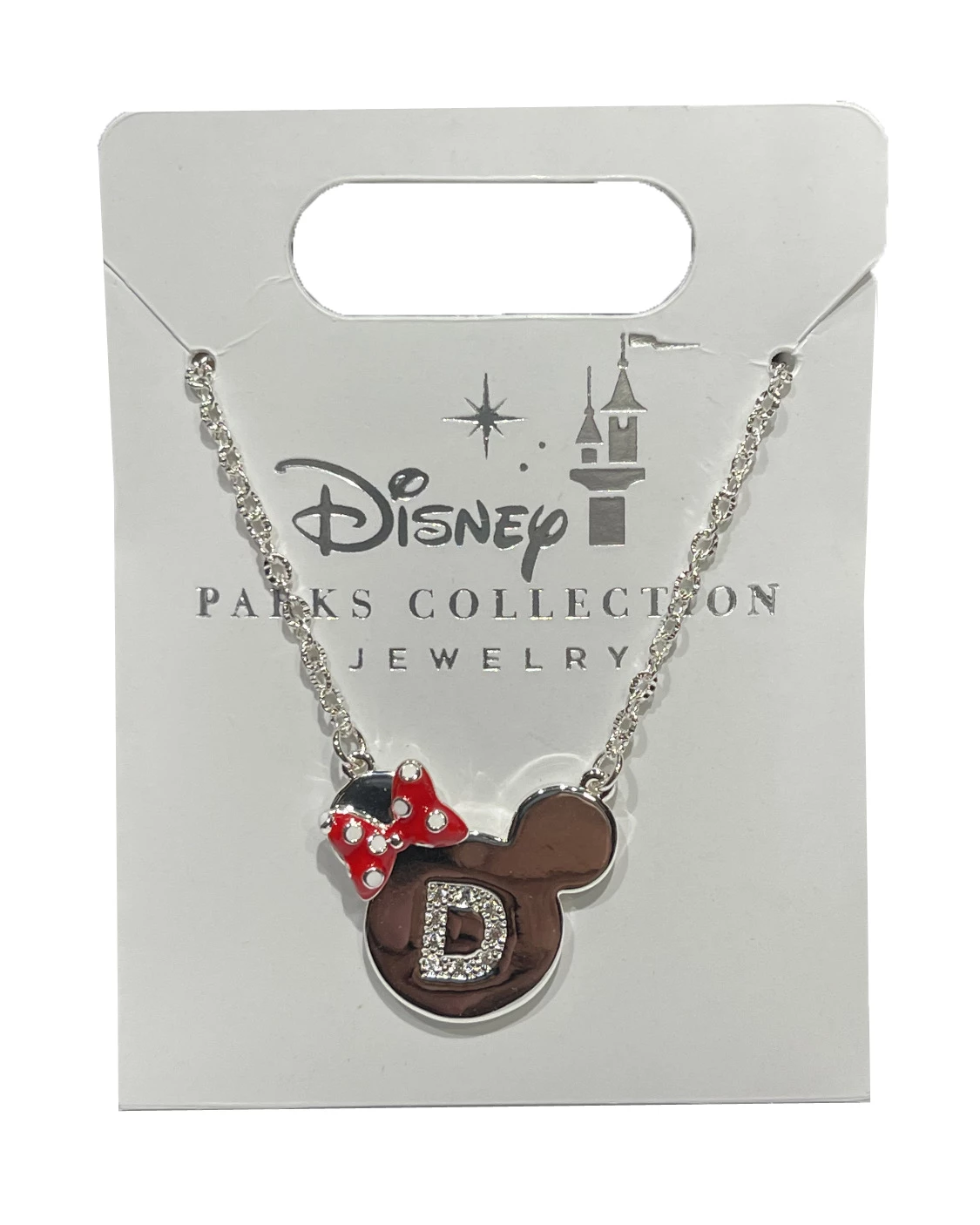 This Initial necklace features Minnie Mouse with crystal letter in the center, topped with Minnie’s Signature Bow.